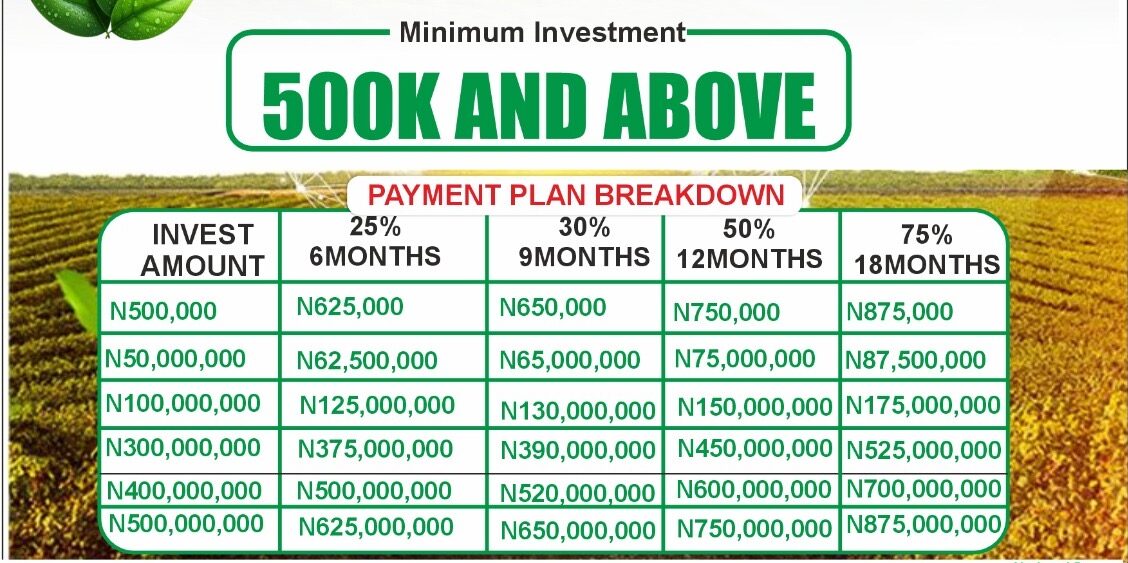 We offer: – 6-Month Plan: Minimum N500,000 with 25% ROI. – 9-Month Plan: Minimum N500,000 with 30% ROI. – 12-Month Plan: Minimum N500,000 with 50% ROI. – 18-Month Plan: Minimum N500,000 with an ROI of 75%.
